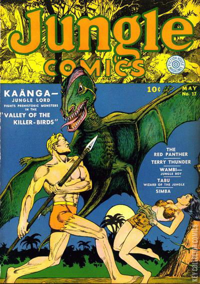 Cover art by John Celardo. "Valley of the Killer-Birds," art by John Celardo; Kaänga and Ann are briefly lost in a lost valley where prehistoric creatures survive to today. Untitled story; Crashed pilot Carolyn is pursued by Arab slavers until The Red Panther manages her rescue. Untitled story; Tabu, Wizard of the Jungle rescues the niece of a diamond hunter who is determined to seize a cursed gem. Untitled story; Pygmies attack Camilla's people, seeking revenge for the death of their chief's son. "Sacred River of Gold" text story. Untitled story, art by Bill Bossert; Disguised as Mussolini, Blubber Ben incites war between the Wazans and Stabwans, using Vincent as a symbol. Untitled story, art by Al Walker; Simba protects a plague stricken orphan from the killers of the jungle and leads him to a safari with a doctor. Untitled story, art by Henry Kiefer; Wambi rescues a scientist from the dungeons of the sultan. Untitled story, Fantomah encourages an evil witch doctor to use his wisdom for the good of this people; Roy rescues an explorer who is trying to get out of the jungle with the Azali Ruby.