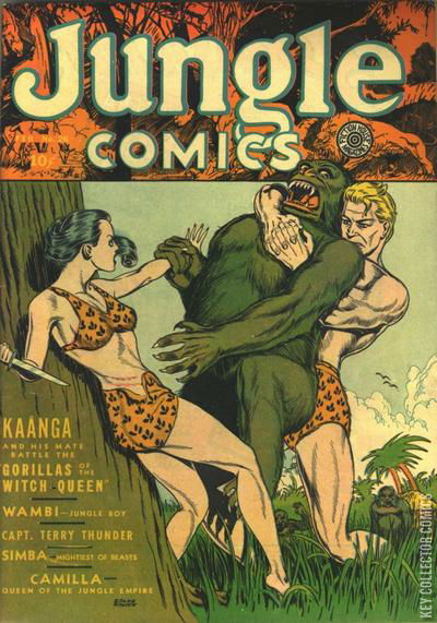 Cover art by Dan Zolnerowich. "Gorillas of the Witch-Queen," art by Dan Zolnerowich; The White Queen of the Apes kidnaps Ann to use as leverage to force Kaänga to marry her. Untitled story, art by Henry Kiefer; Wambi tries to persuade the rajah to curtail his hunting which has made game animals very scarce in the jungle. Untitled story; Natives kidnap Gai in order to extort rifles from her trading post father; Tabu rescues her and causes the natives to be eaten by vultures. Untitled story, pencils by George Appel; Red Panther leads treasure hunters to a distant valley where they learn that their treasure map's treasure is the long-lost daughter of the map maker. "The Python Trap" text story. Untitled story; Despondent Vincent, pining for his own kind, leaves the gang but searching for him leads to a pair of explorers in need of rescue. Untitled story, pencils by George Appel; Camilla must overcome a mutinous longboat crew on her way to rescue her pygmy friends from one of their neighboring tribes. Untitled story; Roy is the object of a murder-by-leopard attempt by the pro-Nazi General Badeaux. Untitled story; Ken is taken captive by a treasure hunter who has dammed a river in order to expose an ancient Egyptian city filled with gold