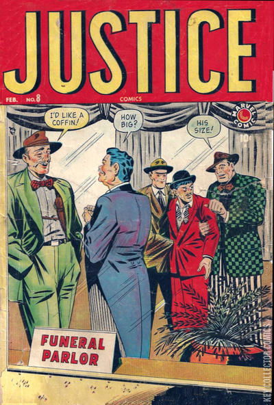 Home / Atlas / Justice / Justice #8 Atlas Released February 1949 Justice #8 Add to Collection Want It Synopsis No synopsis available. Issue 7 of 52 Add to Collection Buy it on eBay Buy on eBay Low $35 Mid $105 High $350 Synopsis No synopsis available. Details Series Justice Cover Date February 1949 Pages N/A UPC N/A Cover Price N/A Final Order Cutoff N/A Creators No creators listed. Price Guide Log in or subscribe to access detailed graded price information and market insights. Log In Subscribe