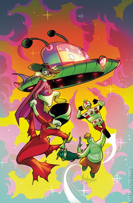 Darkwing Duck Is Teaming Up - Whether He Likes It or Not! Foes of evil! Enemies of injustice! To the mighty heroes of the JUSTICE DUCKS, all bad guys are a total bummer and must be taken down - even if said bad-o's are from OUTER SPACE! In this thrilling maiden issue: Flying saucers descend from the skies, to (maybe) wreak (possible) havoc upon the (mostly) innocent citizens of St. Canard! All that's stopping these aggressive alien agitators is STEGMUTT, GIZMODUCK, NEPTUNIA, MORGANA, and (most important, in his opinion) DARKWING DUCK! Written by the Eisner and Harvey Award-winning ROGER LANGRIDGE and illustrated by celebrated Darkwing Duck artist CARLO LAURO, this latest chapter in the ongoing saga of St. Canard's web-footed wonders is surely destined for greatness - just like DD himself!