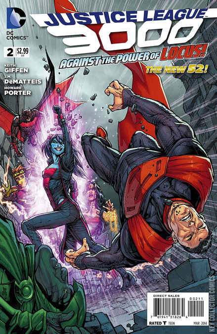 THINGS FALL APART On another mission for the Wonder Twins the 31st Century Justice League find themselves teleported to a wasteland planet as a stepping-stone to their target planet to avoid detection and The Five's armies. While the Leaguers struggle to comprehend their new lack of powers and situation the Wonder Twins squabble and inadvertently call their team "brain-damaged children" as they listen in. With communications closed out of awkwardness Green Lantern carries the team over to their target while the Wonder Twins receive an alarming warning that Locus is on that world. Their attempts to warn the team fall on deaf ears as they rush to prove themselves against the 19-year old reality warper. In a bar Locus laments her romantic failures to Coeval - a fellow member of the Five - who distracts her by directing her to the League 3000 who had all just made their landing upon the planet. While they surveyed their surroundings Locus interrupts causing Superman to charge straight in and be blown away immediately. Though the Leaguers put up some resistance to her overwhelming power she tears the Flash apart effortlessly and shrinks Green Lantern down to steal him away for herself. The other members are teleported away to Takron-Galtos as the Twins are told that the data they had on the armies was fabricated by Coeval who wanted to lure the League into a trap.