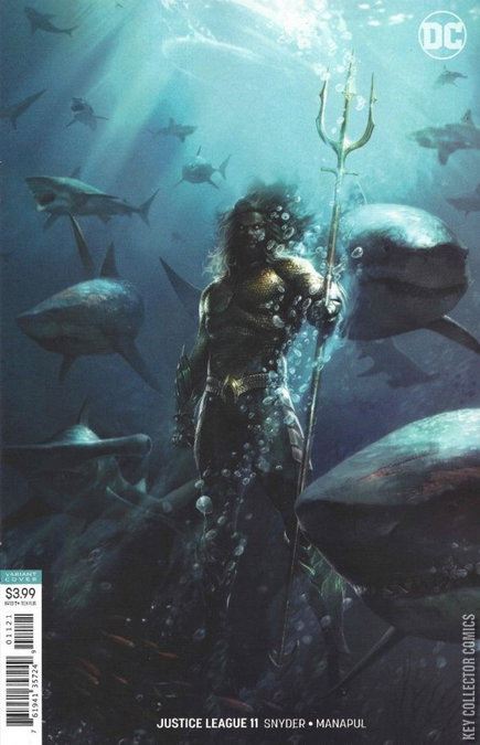 DROWNED EARTH, PART TWO The Justice League is scattered across the Seven Seas, pursued by the Ocean Lords and their army of alien mercenaries and constantly at risk of turning into fish monsters. You know, just a day at the beach. Their only hope lies in the crippled Aquaman, who believes the road to victory lies in unleashing equally vengeful gods on Earth’s oceans. Meanwhile, Batman guards the Totality in the sunken Hall of Justice, where no one can attack him…or can they?
