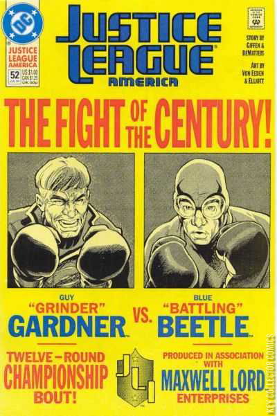 "The Battle of the Month" Blue Beetle and Guy Gardner take each other on in a one-on-one boxing match in the ring. After Gardner pushes Beetle too far by teasing him about his recurrent weight problem, they start brawling, and General Glory suggests they handle it the old-fashioned way. Every League member present is delighted to watch. Kord is winning punch for punch, quicker and more technically skilled than Guy is, and he gives Guy a nosebleed. Enraged about bleeding, Guy blindsides Beetle from behind while his back is turned, and beats him so hard that he injures his ribs. He's pulled off of the hunched over Beetle, and Martian Manhunter announces that for crossing over the line like this he's going to be thrown off the team at the next opportunity they have. Guy refuses to apologize, stomps off, and even makes Ice cry by saying he doesn't need her or the League. Fire threatens him to never come near her again. Although he rebuffs her and pretends he doesn't care, he seems regretful after she's left. Blue Beetle is bed-ridden until his injuries recover. Later that night, while bringing a woman home to the embassy, Maxwell Lord is shot by an unseen assassin, leading into Breakdowns.