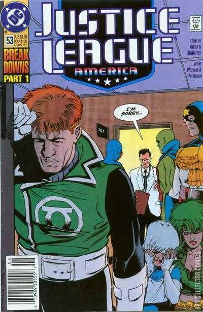 "Breakdowns Part 1 - Blown Away" MAXWELL LORD IS SHOT. The Justice League deals with the attempted assassination of their leader who is now in a coma. To replace Maxwell Lord, the U.N. appoints Kurt Heimlich who announces there will be a massive breakdown and restructuring of the League. Continues in Justice League Europe (1989) #29.