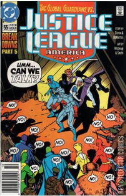 "Breakdowns Part 5 - Bialya Blues" Ordered by Kurt Heimlich to stop the five former members of the Justice League International who have gone to Bialya, the JLI find their former teammates in an all-out battle with the Global Guardians. The battle culminates in the destruction of an entire city block, and the revelation that Doctor Mist was actually a robotic doppelganger. Jack O' also dies in the battle, and elsewhere Sumaan Harjavti assassinates the Queen Bee and takes her place as the ruler of Bialya. Continues in Justice League Europe (1989) #31.