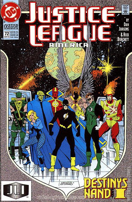 "Destiny's Hand: Part I" The Justice League begins to adopt violent, authoritarian methods. When the Secret Society of Super-Villains invades a museum in order to steal an artifact, Martian Manhunter breaks Sinestro's arm and kills Star Sapphire with his Martian vision. Sinestro flee to other city, disguised. He is discovered by Green Arrow and Black Canary. Hawkman smashes Sinestro's face with his mace; After it he orders soldiers in Nevada to amputate the arms of Sinestro. China starts nuclear warheads against JLA, but the silos are sabotaged by Atom, and the explosion occurs in China itself. Meanwhile, Dr. Destiny murmurs in Arkham Asylum. None of the JLAers, villains and situations match the mainstream universe. This is all part of a dreamverse created by Dr. Destiny. This universe seems set on the past, when (very probably) Gerald Ford was president, not Bill Clinton. In the mainstream universe, in this point of time (1993), Blockbuster, Flash Barry Allen and Sinestro were already dead, the Justice League Satellite was destroyed. The man behind Hawkman's identity is unidentified, probably Carter Hall (See Hawkman is confusing). The Wizard matches his Secret Society version, when he needed wear three artifacts to compensate his waned powers. The Star Sapphire who was part of the Secret Society of Super-Villains in our world was not Carol Ferris, but instead Remoni-Notra, who assumed the Earthian identity of Deborah Darnell. The Dreamverse Hal Jordan wears a costume resembling his early costume, as it doesn't have the green shoulders that his then-current Green Lantern costume had. Dreamverse Batman wears a blue and grey costume with a plain bat logo (similar to the early costume Batman wore), as opposed to the yellow oval bat logo that the real Batman was wearing at the time