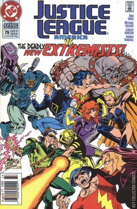 EXTREME MESSURES While Ted Kord considers his place in the world and whether he really belongs with the Justice League any more, his former colleague Ice returns to her people in the hidden kingdom in Norway. The active members of the League, accompanied by their tactical advisor, the original Flash, battle the New Extremists, where the tide is most certainly not in the heroes' favour. As the fight progresses, Dreamslayer speaks to Bloodwynd, trying to persuade him to join the Extremists' cause. This attempt is unsuccessful, and Bloodwynd works together with his colleagues. Once their cooperation becomes more organised, they are able to defeat their opponents, though they are frustrated to discover that the New Extremists literally disappear once the League has the upper hand. Justice League America was biweekly at this point. Cover date 'Late August 1993'.