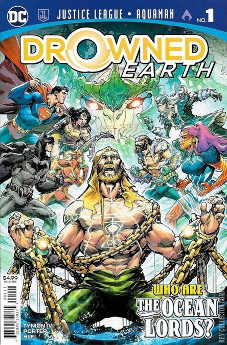 DROWNED EARTH —PART 1 The Ocean Lords—ancient sea gods with a grudge against Aquaman and Wonder Woman—invade the Earth with an alien army and flood the globe. As Batman, Superman and the Flash race to stop the waters from rising and turning everyone into aquatic monsters, Mera seeks the advice of an old enemy, and Arthur must face down Black Manta…or lose his connection to the ocean forever!