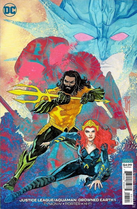 DROWNED EARTH —PART 1 The Ocean Lords—ancient sea gods with a grudge against Aquaman and Wonder Woman—invade the Earth with an alien army and flood the globe. As Batman, Superman and the Flash race to stop the waters from rising and turning everyone into aquatic monsters, Mera seeks the advice of an old enemy, and Arthur must face down Black Manta…or lose his connection to the ocean forever!