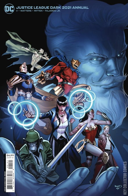 A GLIMMER OF CHILDLIKE HOPE After barely making it out of Atlantis alive, the Justice League Dark regroups and prepares themselves for the ultimate battle for magic against the finest sorcerer to ever live…MERLIN. It’ll take the minds and memories of WONDER WOMAN, RANDHIR SINGH, and an unexpected visitor to unlock the mystery behind the villain’s sudden appearance and what he’s after. Only with that vital information does our team of magical misfits stand a chance at saving the world from a threat the likes of which the Justice League could never survive! You won’t want to miss this oversize tale that’ll affect the future of magic in the DCU for years to come!