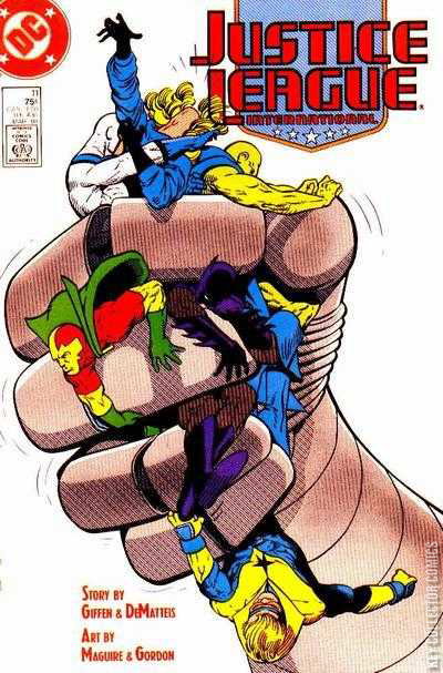 "Constructions!" Max Lord calls Captain Atom and Martian Manhunter into his office to see if he can recruit the heroes they worked with during the recent invasion by the Manhunters.[1] When the duo explain that this was just an ad hoc assembly and there is no chance that the others will join the JLI, Max becomes furious and explains that a supervillain is after him and he needs help. At the Justice League Embassy in New York City, an alarm comes in from Martian Manhunter and Captain Atom. The Leaguers head to Max's office, where they are bombarded by missiles. Batman orders Blue Beetle to ram their shuttle into the building. They discover several mechanical constructs built into the structure for defense and Guy Gardner shorts out all of the electricity with his power ring. They make their way to Max's office where their teammates are safe. As the League flies away to follow the source of a giant power spike, a giant robot claiming to be The Construct rises from underground, challenging them to battle. The giant is recalled to its cavernous base where it collapses in a heap, making cryptic references to its master. The Leaguers follow it inside and come face to face with Metron.
