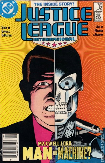 "Who Is Maxwell Lord?" Maxwell Lord's origin is told. After following a mammoth robot Construct to a mountainous bunker,[1] the Justice League finds its "master": Metron. He blames them for the loss of his information retrieval unit and Captain Atom begins smarting off to Metron, without realizing the vast power has has as a New God. Mister Miracle holds Atom back and apologizes to keep a tenuous peace and talk about what is happening instead of resorting to violence. Metron explains that he was beckoned to Earth by a device of his and makes psychic contact with the retrieval unit, discovering that it has developed sentience. This newly-living mechanical being does not want them to cooperate. Meanwhile at The Dome, Green Flame and Ice Maiden decide to quit the Global Guardians in hopes of furthering their careers as members of the Justice League. They fly to Rio de Janeiro and consult with Ernesto Lopez, the bureau chief of the Justice League Embassy. Back at Maxwell Lord's home, he is disturbed to find the body of his personal assistant Ms. Wootenhoffer lying dead before him. The computer intelligence that once belonged to Metron informs Lord that Wootenhoffer was a Manhunter, and had to be destroyed. Max stares at the computer monitoring station, as the A.I. converses both on the screen and in Max's mind. The computer intelligence is committed to replacing mankind's leaders with robots who can rule with efficiency. Max reflects upon the dark choices he has made in his career. He remembers plotting the death of his company's former president by faking a spelunking accident, and how those very circumstances first brought him into contact with the Kilg%re. With no idea of the device's Fourth World origins, Max interfaced with the machine and used its abilities to acquire financial power. From there, he insinuated his way into the Justice League, and manipulated events to gain the team an international charter. His schemed a terrorist event to gain them international fame,[2] persuaded Booster Gold[3] and Dr. Light to join, and even created the Ace Android for the Royal Flush Gang.[4] Eventually, the computer intelligence faked a global crisis to get the United Nations to charter the JLI.[5] Max feels sickened by everything he has done. Picking up an iron bar, he smashes the control console of the retrieval unit, ending its existence, and by extension, its hold over him. Elsewhere, this causes Metron's psychic connection with it to terminate and so he rapidly leaves Earth to pursue knowledge elsewhere. Exhausted and injured, Max falls over unconscious. He awakens the next day in a hospital bed. Mister Miracle and Oberon visit, confident that Max is going to be okay.