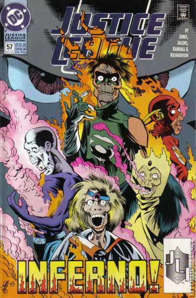 "Inferno!" The members of Justice League International are unconscious as the druids set fire to their castle headquarters. When Doctor Light comes round, she tries to get Godfrey to move everybody to safety, but there is no response - Flash and Elongated Man had told him not to respond to Kimiyo as a test of his abilities. However, her mysterious astral friend manages to possess Godfrey's body and carry everyone to a safer part of the castle until someone who can command Gofrey wakes up. With the help of intelligence gleaned by their invisible ally, the heroes take back the castle, but find themselves up against the powerful Grand Druid. This man is only defeated by Duke Donald. Once the druids have been taken away by the police, Elongated Man and Sue Dibny announce that they are leaving the League, largely due to the number of times Sue's life has been put in danger. They are to go traveling, and Duke Donald opts to accompany them.