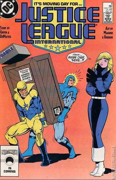 "Moving Day" This book is just like it says it is moving day for the newly formed Justice League International. This marks the beginning of the new Justice League and the end of the Global Guardians. In this book several Justice League Headquarters are opened up all over the world. The most notable locations are New York, Russia and France. The league is divided and are building their defenses for the new league. There are problems however. As the New York League is set the league finds out that the building the United States gives them is made out of tissue paper and in the Russia headquarters Batman discovers several listening devices. In the last pages of the book it is the end of the Global Guardians. Jack O'Lantern takes it the worse and ominously swears it an't over.