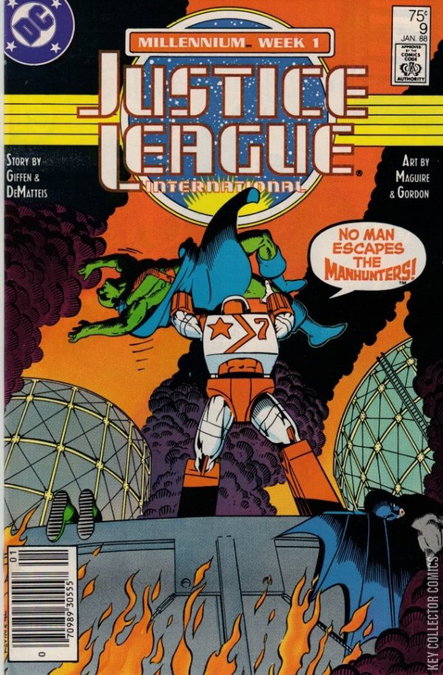 SEEING RED The Justice League is betrayed by Rocket Red #7 who turns out be a Robot Manhunter. After almost killing the entire League he is stopped by the Rocket Red Squadron. and later killed when Booster puts a force field around him as he tries to blast him with his last missile. This in turns obliterates the Manhunter. Later Harjavti conspires with the Jack O'Lantern to create a force opposed to the Justice League International.