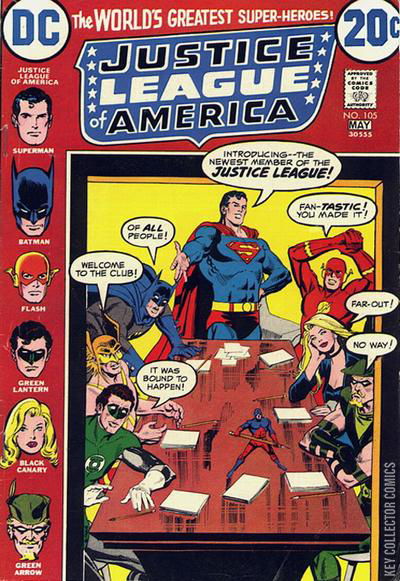 SPECTER IN THE SHADOWS! The Justice League elects the Elongated Man to membership, and he immediately involves them in the case of a group of pliable putty-beings who are stealing seemingly useless objects. As the League splits up to deal with the putty-men, a mysterious figure follows them, and saves them when they are in danger. He rescues Flash, Green Arrow, and Atom from a mine disaster in the town of Desolation, helps Superman and Black Canary in Motor City, and comes to Green Lantern's aid on the California coast. The Elongated Man, however, disappears in an undersea battle with the pliable robbers, and is presumed dead. The JLA members trail their foes to a giant mechanical hive in the Florida Everglades, where they discover that the Elongated Man has merely disguised himself as one of the putty-men to infiltrate this hideout. The mystery man again appears, prevents the hideout from self-destructing, and is revealed as the Red Tornado, who had been thought dead since his destruction of the giant hand-menace in the recent adventure with the Justice Society.