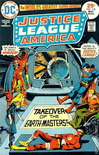 TAKEOVER OF THE EARTH-MASTERS! Misinterpreting a radio-telescope message from Earth, aliens known as the Adaptoids believe the members of the Justice League to be super-powered tyrants, and so attack them with their evolutionary powers. After Red Tornado, Black Canary, Aquaman, Flash, and Superman are side-lined by injuries, they depend on Hawkman to call in reinforcements. Instead, the Winged Wonder, who had been exhibiting strange behavior due to his distraction over his exile from his wife and homeworld, seems to desert the team to return to Thanagar.