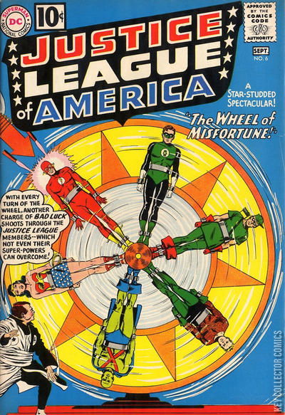 THE WHEEL OF MISFORTUNE! The criminal professor Amos Fortune gloating over his wheel of misfortune, which holds the members of the Justice League captive. Surely our super heroes don't believe in bad luck? But when Aquaman encounters an ancient curse, Wonder Woman has her path crossed by a black cat, The Flash breaks a mirror, Green Lantern spills some salt, Green Arrow runs under a ladder and Martian Manhunter breaks a spiders web - and each JLAer then makes an uncharacteristic mistake in the carrying out of their duties, they begin to wonder. Present as an observer at each event has been the man known as Amos Fortune. Fortune believes he is responsible for the bad luck each JLA member has just encountered. Fortune has studied luck for years - eventually finding a formula he believes never fails - and has discovered that the human body can be controlled by stimulating the twin good luck and bad luck glands within them. Fortune has developed a Stimoluck - a scientific invention he uses to stimulate his own good luck and the JLA's bad luck. When the JLA meet for their regular monthly meeting, the stories of their bad luck comes to the fore. As soon as they realize what has been happening, and reach the conclusion that someone could have planned the whole thing, they dismiss that particular idea and turn their attention to a couple of letters they have received. Splitting into teams, Green Arrow joins the Flash and J'onn J'onzz to investigate a case of lost treasure...