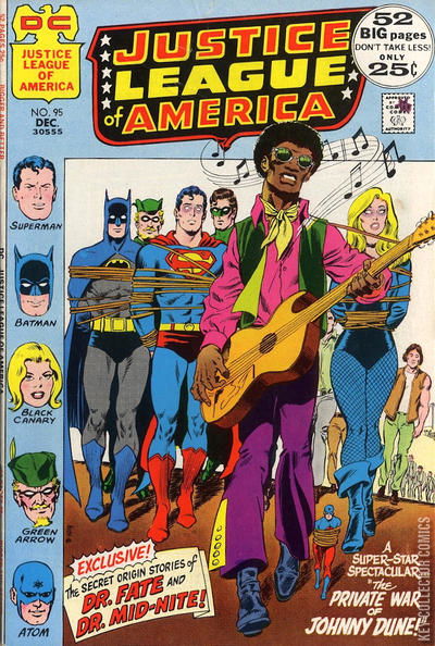 THE PRIVATE WAR OF JOHNNY DUNE! When the JLA satellite's teleport beam is intercepted by a Zeta-beam from the planet Rann, Flash, Green Lantern, and Hawkman suddenly find themselves on Adam Strange's adopted world. While Superman joins them to combat a menace there, Green Arrow and Atom are attacked at a benefit concert. Johnny Dune, a black Viet Nam veteran, has returned from overseas and become a pop music star, but is betrayed in his attempt to enter politics as a mayoral candidate. In revenge, he uses his newly discovered mutant vocal powers to control the minds of his audiences and turn them against the established order, and it is this menace that Green Arrow and Atom face. Joined by Batman and Black Canary, the JLA heroes are captured by Dune's thralls. When his control wavers and the group begins to form an uncontrollable mob, Dune sees the error of his ways and ends the riot by turning his followers against himself. The Justice League rushes him to a hospital in time to save his life, but his mutant power is destroyed.