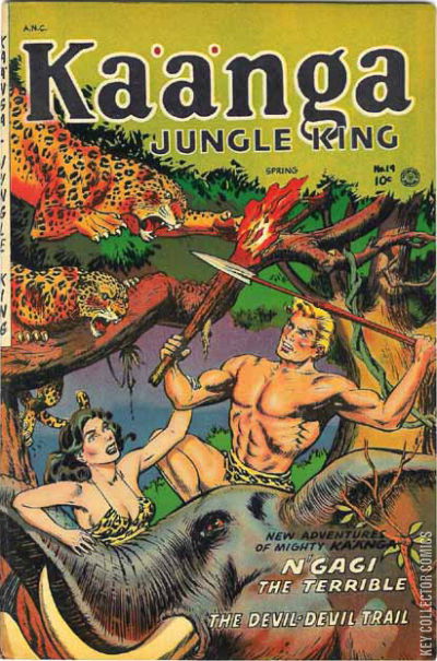 "N'Gagi the Terrible"; Three treasure hunters plot with the Manzanis' witch doctor, Moroto, using a projection of a giant ape, to steal the Manzanis' treasures; Ann exposes the fraud, and Kaänga pursues the criminals, capturing them and restoring the treasure. Theodore Roosevelt bio, art by Mike Peppe. Oddities of the Dark Continent fact page, art by Mike Peppe. Untitled story, art by Charles Sultan; Captain Terry Thunder pursues the treasure hunter King Cobra; Cobra is a master of disguise, but Terry turns the tables and disguises himself as Cobra to infiltrate Cobra's operation; With the arrival of the lancers Cobra's men are defeated and Cobra himself perishes in a fire. 36 pgs., full color. Cover price $0.10.