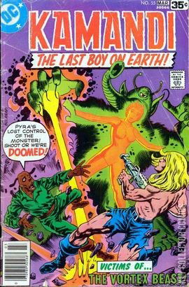 Kamandi, Pyra and Dr. Canus watch over the cocooned body of Spirit when dozens of animal men fearfully rush out of the woods. One of the Tiger-Men tells them that the Vortex Beast is right behind them and it eats energy and will be attracted by Pyra's ship. They try to get Spirit onto the ship and take off before it's too late but the Vortex Beast appears and drains the ship before it can escape. Kamandi grabs an energy rifle and tries to lure the beast away from the ship. It gets the rifle and causes it to explode drinking the energy then captures Kamandi. Meanwhile Bloodstalker has tracked Kamandi to the cocoon creature's lair and encounters the Tiger-Man whom Kamandi spoke to earlier. Realizing who it was, and remembering there's a reward for his capture, the Tiger-Man prepares to go back and catch him but Bloodstalker takes him down and interrogates him. Kamandi hits the Vortex Beast and the creature lets him go. Dr. Canus reveals that the creature is simply drowsy after consuming a large meal. Spirit awakens from the cocoon transformed with the racial memories of the Caterpillar people and their ability to spin cocoon fibers. The Beast awakens and attacks the ship again draining it's remaining power. Pyra turns to energy hoping to lure the creature away but the Beast absorbs her. Pyra manages to temporarily take control, long enough for Kamandi to realize that the cocoon Spirit was encased in was energy resistent. Spirit spins a cocoon around the Beast. Attempting to free itself, the Beast releases all its energy and dissipates. Pyra reassembles her human form and the four adventurers prepare to leave when Bloodstalker arrives to stop them.