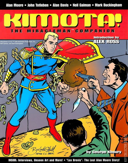 KIMOTA! contains interviews with Alan Moore and all of the other major Miracleman contributors (including with creator Mick Anglo), as well as the definite checklist, an original Alan Moore script, 3 pages of the unpublished story by Neil Gaiman & Mark Buckingham, much unseen Miracleman art, and lots more cool stuff. Cover by Mark Buckingham & Introduction/Back Cover by Alex Ross.