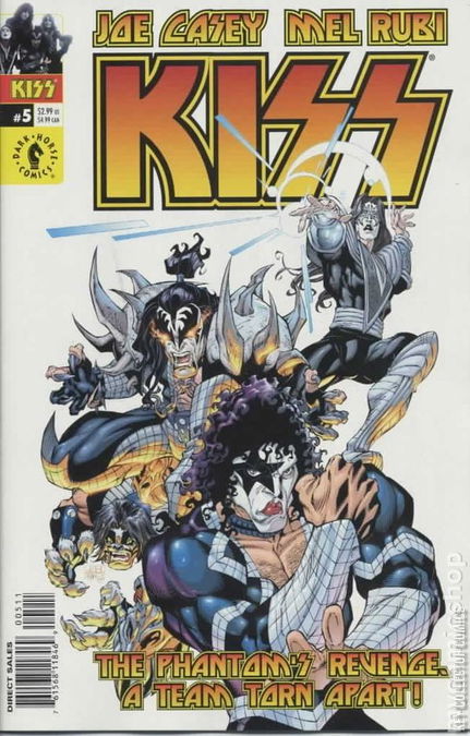by JOE CASEY and MEL RUBI; cover by MEL RUBI It's robot madness as our mad scientist sets in motion his plan for the ultimate revenge against the boys of KISS. Internal troubles are more dangerous, as the Starchild takes a psychedelic journey into the Celestial's alien mind to save him, and the Demon's evil robotic double has infiltrated the Simmons Foundation to take on the Beast King. Joe Casey writes and Mel Rubi draws the action-packed fifth issue of the hard rockin' new Kiss comic! FC, 32pg (Rubi cover) Cover price $2.99.