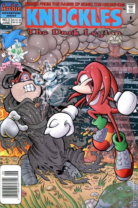 Knuckles the Echidna #3 is the third issue of the Knuckles the Echidna comic. It was originally part 3 of a three issue mini-series, until the series was expanded to a full comic series. This comic features one story: "The Dark Legion - Blood is Thicker". In the distant past, the Dark Legion wages war on Echidnaopolis. The High Council meets to discuss the matter, but is interrupted by the Guardian Steppenwolf, who encourages the High Councilor to not give in to the Legion. In the present, Knuckles and the Chaotix are faced with a stampede of Floating Island citizens heading towards them, trying to escape the forest fire. The group comes across some of the crashed vessels and, stealing Legion cloaks to disguise themselves, hijack the hovercrafts for their own use. The group finds the Dark Legion's base, an ancient technological facility that had been hidden under the island's surface, and Knuckles wonders how it could have been built without anyone knowing about it.