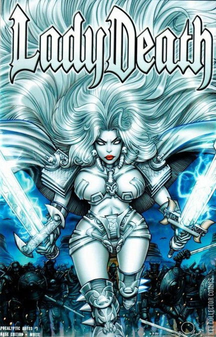 Lady Death: Apocalyptic Abyss builds on the mythology we created in Chaos Rules #1, Damnation Game #1, Extinction Express #1, Oblivion Kiss #1, Merciless Onslaught #1 & Unholy Ruin #1.  It is the 7th chapter in Lady Death's new Coffin Comic's era!  This is the 24-page edition, which includes part one of the complete story featured in the 48-page hardcover version.