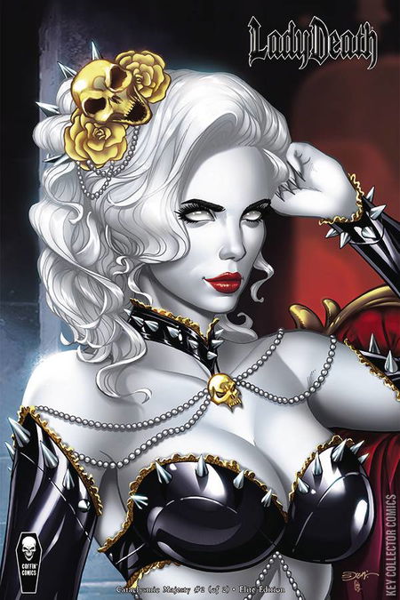 "Deathocalypse," an official, year-long company-wide event unfolds here! Caprice's mental manipulations unleashed Lady Death's evil side and New Orleans paid the price in wanton death and destruction. Recovered, Lady Death is now seen worldwide as a villain to be feared and eliminated. Meanwhile, the extinction-level villain Insurrectus and his new mate Atrocity plan to usher in a new horrific age of terror. Can the diva of death overcome this catastrophic crusade she struggles against her own wicked appetites, or are we all doomed once and for all?
