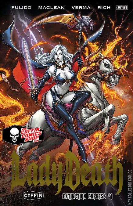 The Hellbourne Elders dispatch Atrocitas, an insane angel/demon hybrid assassin to destroy Lady Death for once and for all. But their epic confrontation proves tragic for a beloved character and sets in motion events that will change Lady Death's undead life forever! Is this the road to extinction? Featuring the diabolical return of Hellwitch and the first appearance of Chaotica, a major new character in the Lady Death Universe.