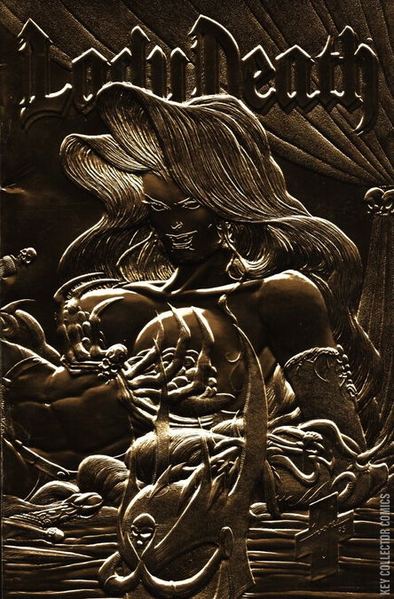 This issue is the first Lady Death issue to contain a centerfold poster. Lady Death is in the void between worlds, trapped there when Pagan shoved her through when a voice enters her mind. It tells her to choose her destiny. She tries to ignore it. In another realm Vandala wonders that this woman is supposed to be a savior that just wallows in her sad past. The Judgement Era is coming for the Fallen Angels and Lady Death has the central role to fulfill. In desperation Vandala enters the void and collects the unconscious Lady Death. Before recorded time in another realm the fallen angel Agony arrives in Manicore, a lush jungle world thats is now frozen solid by Agony's despair. Lady Death is cast ito this frozen world and her coming is like a fiery comet that melts the jungle where she crashes to earth. Agony sends out her demons to slay anything that has broken the peace in her realm. Lady Death awakes confused and cold her power still not fully returned she is unable to summon Darkness and her clothes in tatters. She fights Agony's demons and gathers information from them somehow understanding their strange language. Being a creature of the Pit the ice melts around her as she walks the land. She wonders if Agony is the voice she heard in the void. She fashions a spear from wood and is forced to walk with her powers still so weak. A woman appears and beckons her to come underground before Agony comes for them. The woman believes Lady Death to be their savior, she quickly puts that notion to rest but follows her down into the ground. In hell the city of Androk is rocked by an earthquake and a volcano rises. the legends have it that there was a prophecy that a time would come when all in Hell would be judged. fearing that it might be true Lucifer gave some of his power to a Grand Duke of Hell, Asteroth, with orders to slay the one would come and slay him. Beneath the surface Lady Death is introduced to Pandemonium who thinks she is an angel,...
