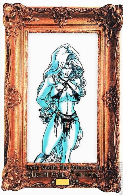 This issue is the first Lady Death issue to contain a centerfold poster. Lady Death is in the void between worlds, trapped there when Pagan shoved her through when a voice enters her mind. It tells her to choose her destiny. She tries to ignore it. In another realm Vandala wonders that this woman is supposed to be a savior that just wallows in her sad past. The Judgement Era is coming for the Fallen Angels and Lady Death has the central role to fulfill. In desperation Vandala enters the void and collects the unconscious Lady Death. Before recorded time in another realm the fallen angel Agony arrives in Manicore, a lush jungle world thats is now frozen solid by Agony's despair. Lady Death is cast ito this frozen world and her coming is like a fiery comet that melts the jungle where she crashes to earth. Agony sends out her demons to slay anything that has broken the peace in her realm. Lady Death awakes confused and cold her power still not fully returned she is unable to summon Darkness and her clothes in tatters. She fights Agony's demons and gathers information from them somehow understanding their strange language. Being a creature of the Pit the ice melts around her as she walks the land. She wonders if Agony is the voice she heard in the void. She fashions a spear from wood and is forced to walk with her powers still so weak. A woman appears and beckons her to come underground before Agony comes for them. The woman believes Lady Death to be their savior, she quickly puts that notion to rest but follows her down into the ground. In hell the city of Androk is rocked by an earthquake and a volcano rises. the legends have it that there was a prophecy that a time would come when all in Hell would be judged. fearing that it might be true Lucifer gave some of his power to a Grand Duke of Hell, Asteroth, with orders to slay the one would come and slay him. Beneath the surface Lady Death is introduced to Pandemonium who thinks she is an angel,...