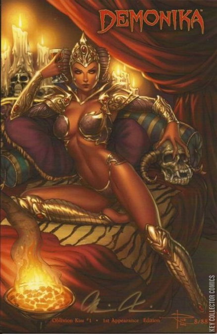 To save her beloved steed Vassago from eternal torment, Lady Death is drawn the wasteland City Siduri where lust isn't a sin, it is a way of life. Instead she encounters the demon sorceress Demonika, is put under an ironclad spell and made to be a plaything to be auctioned off to the highest demon bidder. Is all hope lost? C'mon, it's Lady Death! Lady Death: Oblivion Kiss #1 is a 48-page all-new square bound graphic novel that builds on the mythology creator Brian Pulido has began in Chaos Rules #1, Damnation Game #1, and Oblivion Kiss #1.