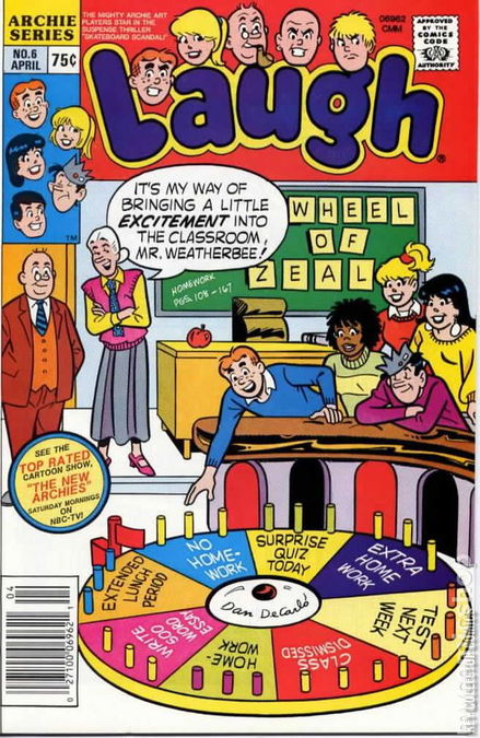 Cover pencils by Dan De Carlo. AIDS awareness public service announcement with the Archie gang, art by Dan DeCarlo, Jr. "Skateboard Scandal," script by George Gladir, pencils by Stan Goldberg, inks by Rudy Lapick; James Bland, Agent Double O Zero, battles the Skull and Iron Arm and their plot to sabotage skateboards. Statement of ownership: Average number of copies sold during preceding 12 months: 53,338; Actual number sold of issue nearest filing date: 54,102. "Rare Scare," script by George Gladir, pencils by Stan Goldberg, inks by Jim DeCarlo; Sabrina's date brings a scary movie for them to watch, but he's the one that ends up scared by a night at Sabrina's house. "Stupid Cupid," script by George Gladir, pencils by Chic Stone, inks b y Rudy Lapick; Archie and Jughead start a business to help guys impress their girlfriends, but they turn out to be very bad at it. "Recipe for Success," script by Bill Webb, pencils by Stan Goldberg, inks by Mike Esposito; Melody and Alex try to make a cake for Josie's birthday, but luckily Mr. Cabot saves the day (to Alexandra's disgust). Archie Club News.