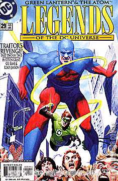 As a result of Traitor's machinations, the Atom towers over his JLA buddy, Hal Jordan! But has the Atom been enlarged? Or is it Green Lantern who's been reduced? The answer may lie in GL's ring, but only if the Atom himself wields it!