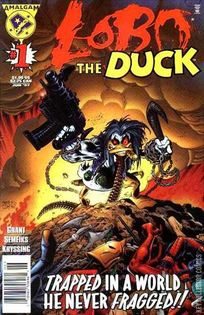 In order to save two universes, the young hero known as Access was forced to use the power of Amalgam (see Marvel versus DC (1996) #3). In this issue, the Master of Quack-Fu, Howard the Duck, and the Main Man, Lobo, are merged to create Lobo the Duck. The world is in ruins and all of Earth's heroes are dead and gone. In this post-apocalyptic landscape only the creature known as Lobo the Duck can thrive.