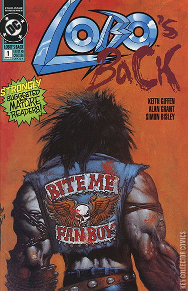 The Final Fragdown This is the 1st printing. 2nd printings are identified by having a Roman Numeral "II" in the price box on front cover. Everybody's favorite bad boy of comics returns! This time Lobo's taken a job as a skip-tracer, courtesy of his old friend Ramona, the skip-tracing hairdresser who's set him on the trail of his bounty, Loo. That's Loo, the self-proclaimed 'baddest bastich in the galaxy'...who may just be a match for Lobo himself. Yeah, right! LOBO'S BACK is a pulse-pounding, action-packed bonanza of violence, hilarity and more violence, brought to you by the creative team responsible for LOBO: THE LAST CZARNIAN and THE LOBO PARAMILITARY CHRISTMAS SPECIAL: writers Keith Giffen and Alan Grant, and artist Simon Bisley, who provides both interior art and covers. All the covers, because issue #1 features three separate covers, but all three appear on every copy - no fraggin' variant editions here. Strongly and Vehemently Suggested for Mature Readers...so put it back, kid! Comic has consecutively 3 full covers on glossy paper complete with title, credits and masthead, Only the first cover has the indicia on the reverse, however. The front cover to this issue and the cover to the next issue in the series created a bit of controversy as the muscles on the back of the arms leading down to Lobo's elbow are surprisingly phallic. When asked about this, cover painter Bisley laughed them off as "just muscles." For more phallic cover fun, Lobo kindly directs you to examine Valkyrie's fingers on the cover to Defenders #130 from Marvel Comics.