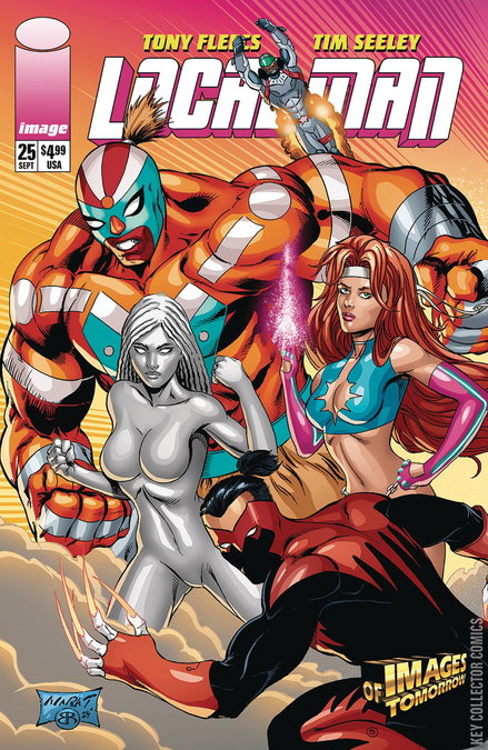 NEW STORY ARCIMAGES OF TOMORROW!Just as the Image Comics line did back in 1995, LOCAL MAN jumps ahead a full year to give you a glimpse of what the future brings, from issue 13...to 25!Third Gen is back with a vengeance! Their first mission? Bring down the reckless young superheroes of Fourth Gen! But will Local Man side with the Zoomers? Or will he help take them down in exchange for getting back the shield and uniform of...CROSSJACK?!The past, present, and future of the Image Universe collide hard in LOCAL MAN #25!On the flip! A corporate retreat at Third Gen HQ leads to...beach volleyball?