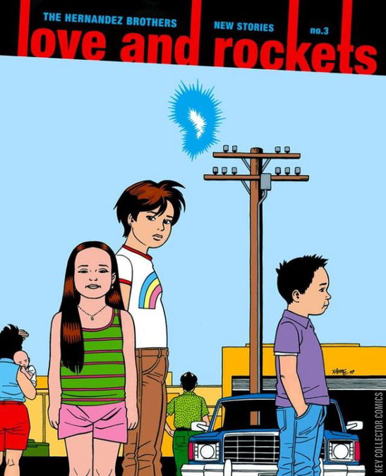All-new stories featuring Jaime’s Maggie and Ray, plus Gilbert’s Fritz and the “Sad Girl.” After Jaime’s two-part super-hero epic from Love and Rockets: New Stories #1 and #2, we return to the enthralling minutiae of the “Locas” cast’s lives for the first time in three years. In the main story Ray finally gets his date with Maggie: The couple goes to an art opening and to dinner, they discuss the crazy world of dreams, and Maggie asks Ray for a huge favor. Also in this volume, “Brown Town, Blue Sun,” a new installment in Jaime’s beloved “little kids” flashback series: A ten-year-old Maggie and her family move away from Hoppers to a desert ghost town… And on the Gilbert side of the ledger, “Scarlet by Starlight” is a story starring Fritz (of High Soft Lisp fame) that (in contrast to #2’s silent masterpiece “Hypnotwist”) consists entirely of a 14-page dialogue scene. “Killer/Sad Girl/Star” picks up the “Sad Girl” character from LRNS #2, and how no one in her family takes her budding film career seriously. 104 pages of black-and-white comics