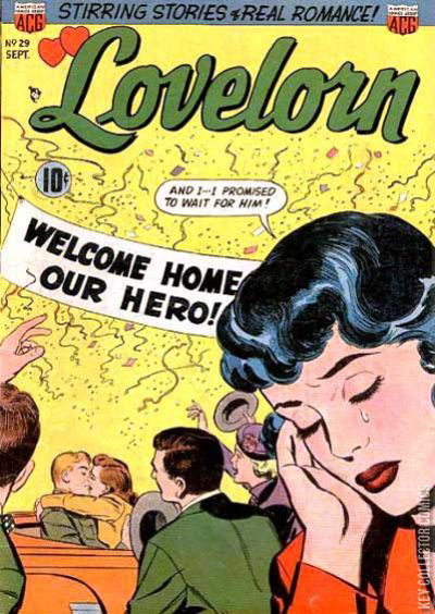 Home / ACG / Lovelorn / Lovelorn #29 ACG Released September 1952 Lovelorn #29 Add to Collection Want It Synopsis No synopsis available. Issue 29 of 74 Add to Collection Buy it on eBay Buy on eBay Low $30 Mid $85 High $275 Synopsis No synopsis available. Details Series Lovelorn Cover Date September 1952 Pages 36 UPC N/A Cover Price $0.10 Final Order Cutoff N/A Creators No creators listed. Price Guide Log in or subscribe to access detailed graded price information and market insights. Log In Subscribe