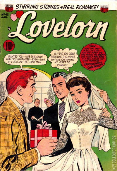 Home / ACG / Lovelorn / Lovelorn #45 ACG Released January 1954 Lovelorn #45 Add to Collection Want It Synopsis No synopsis available. Issue 45 of 74 Add to Collection Buy it on eBay Buy on eBay Low $25 Mid $75 High $250 Synopsis No synopsis available. Details Series Lovelorn Cover Date January 1954 Pages 36 UPC N/A Cover Price $0.10 Final Order Cutoff N/A Creators No creators listed. Price Guide Log in or subscribe to access detailed graded price information and market insights. Log In Subscribe