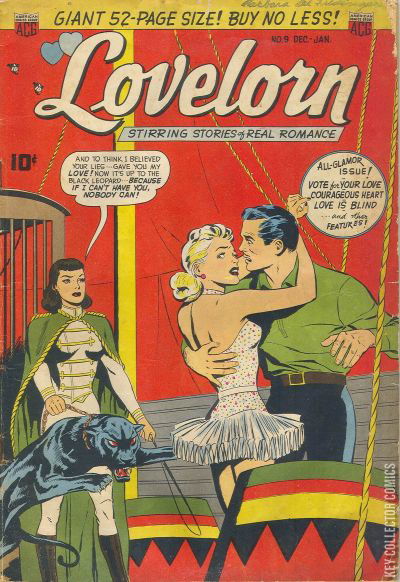 Home / ACG / Lovelorn / Lovelorn #9 ACG Released January 1949 Lovelorn #9 Add to Collection Want It Synopsis No synopsis available. Issue 9 of 74 Add to Collection Buy it on eBay Buy on eBay Low $12 Mid $35 High $120 Synopsis No synopsis available. Details Series Lovelorn Cover Date January 1949 Pages 52 UPC N/A Cover Price $0.10 Final Order Cutoff N/A Creators No creators listed. Price Guide Log in or subscribe to access detailed graded price information and market insights. Log In Subscribe