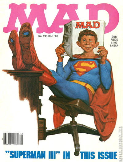 Last $1.00 issue. Cover art by Richard Williams. "Stuporman ZZZ," script by Stan Hart, art by Mort Drucker; In a parody of the film "Superman III," a computer genius turns Stuporman evil at the whim of a corrupt businessman. "Don Martin's Superman III Out-Takes," script and art by Don Martin. "Cosmetics for Kids," script by Dick DeBartolo, art by Bob Clarke; Cosmetic products to make children seem older. "The Lighter Side of ...," script and art by by Dave Berg; A cynical look at dealing with breaking the ice, birthday presents, playing golf, remaining neutral, serving dinner, excuses, new cars, employees, communication, jogging, volunteering, doctors, dating and coming home late. "The Mad School of Parenting," script by Stan Hart, art by George Woodbridge; Course booklet outlining various courses of study in parenting. "Talking Cars of the Future," script by Frank Jacobs, art by Paul Coker Jr.; The potential problems created by cars that can speak are outlined. "If Certain Celebrities Married...What Would Their Children be Like," script by Frank Jacobs, art by Mort Drucker; Depicting the children of unusual pairings and the traits those children would display. "Amending the Rule Books to Cover Sportscasters," script by Tom Koch, art by Jack Davis; Rules designed to curb excessive behavior in the announcing booth. "The Book of Mad," script by Lou Silverstone, art by Jack Rickard; Bob Clark; Pau Coker Jr.; Jack Davis; George Woodbridge; Dave Berg; and Don Martin. "Don Martin's Return of the Jedi Out-Takes," script and art by Don Martin. "T.J. Shnooker," script by Lou Silverstone, art by Angelo Torres. "Spy Vs. Spy" by Antonio Prohias. Mad Fold-In by Al Jaffee. 52 pgs., B&W. Cover price $1.00.