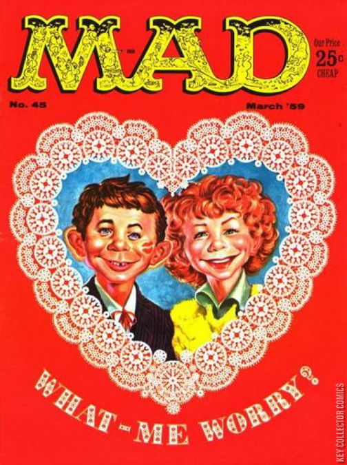 Home / EC / Mad / Mad #45 EC Released March 1959 Mad #45 Add to Collection Want It Synopsis No synopsis available. Issue 46 of 547 Add to Collection Buy it on eBay Buy on eBay Low $5 Mid $12 High $40 Synopsis No synopsis available. Details Series Mad Cover Date March 1959 Pages 52 UPC N/A Cover Price $0.25 Final Order Cutoff N/A Creators Cover Artist Kelly Freas Price Guide Log in or subscribe to access detailed graded price information and market insights. Log In Subscribe