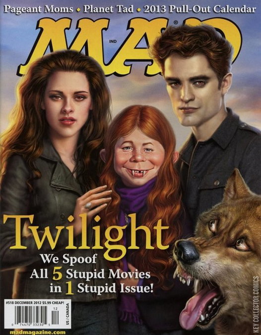 Cover by Mark Fredrickson. Stories and art by Peter Bagge, Dave Berg, Evan Dorkin and Sarah Dyer, Noah Van Sciver, Tom Hart, Al Jaffee, Dick DeBartolo, John Caldwell, Scott Maiko, Jeff Kruse, Teresa Burns Parkhurst, Frank Santopadre, Matt Lassen, Desmond Devlin, Barry Liebmann, Anton Emdin, Paul Coker, Jr., Kit Lively, Scott Nickel, Alex Cline, Peet Tamburino, Dan Shefelman, Jason Yungbluth, Kevin Pope, Tim Carvell, Christopher Baldwin, Tom Bunk, Paul Peter Porges, Tom Richmond, Peter Kuper, and Sergio Aragones, plus Fundalini Pages by Rick Tulka, Ward Sutton, Kenny Keil, Emily Flake, Nick Meglin, Bob Staake, Paul Coker, Jr., Jay Rath, Sam Sisco, Hermann Mejia, Garth Gerhart, and Jeff Kruse. Mad finally parodies the entire Twilight movie saga in one fell swoop. A vintage Lighter Side strip by Dave Berg. Mad keeps up with the new media, including a look at QR codes and selections from Mad's blog, "The Idiotical." Articles featuring art by indie cartoonists Peter Bagge, Noah Van Sciver, Tom Hart, Evan Dorkin and Sarah Dyer. Mad's takes on college, ballot propositions, and pageant moms. Marginals by Sergio Aragones, and Spy vs. Spy. The Fundalini Pages; The Toilet Saga; Are You an Activist or a Slacktivist?; A Mad Look at College; 2013 Calendar: The Year of the Hammerhead; Is Barack Obama a Real American?; Spy vs. Spy; Planet TAD!!!!!; The Mad Vault; The Lighter Side of The Boss; You're a Great Pageant Mom If...; Trademark Graffiti; The Strip Club; Newspapers Weigh in on This Year's Least Important Ballot Propositions; New Shows on the All-Pirate Network; The Best of The Idiotical; Fold-In; Expectorate Native American Sputum. 8.5-in. x 11-in., 60 pages, PC/PB&W. Cover price $5.99.
