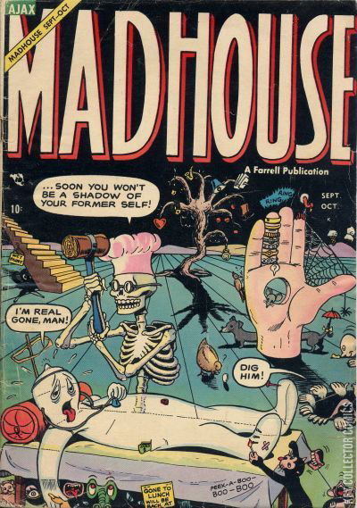 Home / Farrell / Madhouse / Madhouse #4 Farrell Released October 1954 Madhouse #4 Add to Collection Want It Synopsis No synopsis available. Issue 4 of 4 Add to Collection Buy it on eBay Buy on eBay Low $25 Mid $75 High $250 Synopsis No synopsis available. Details Series Madhouse Cover Date October 1954 Pages 36 UPC N/A Cover Price $0.10 Final Order Cutoff N/A Creators No creators listed. Price Guide Log in or subscribe to access detailed graded price information and market insights. Log In Subscribe
