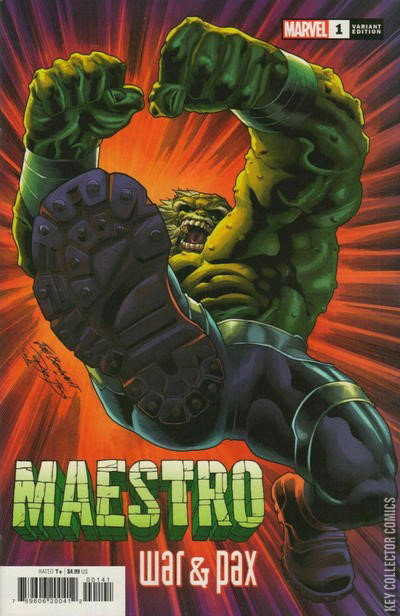 WAR & PAX, PART ONE: VENI PETER DAVID AND THE MAESTRO RETURN IN A BRAND-NEW SERIES! The man once known as the Hulk is now neither man, nor Hulk—call him only THE MAESTRO! After deposing Dystopia’s ancient ruler, the Maestro sets his sights even bigger. It’s time the entire planet Earth recognized their one true god! But the Maestro isn’t the only immortal left…and if he wants to truly dominate the planet, he’ll have to face the most powerful beings in creation! PETER DAVID continues the tale that began decades ago in the legendary Future Imperfect! CONTINUED FROM MAESTRO #5