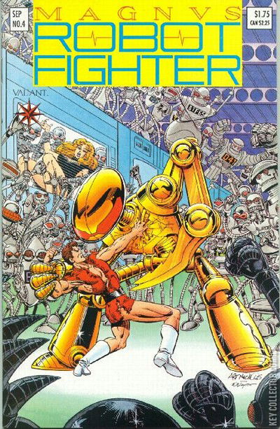The freewill robots gain control of Central-Rob and demand Magnus’ surrender. As Tekla tries to find a peaceful solution to everything, D-15 gains a new, more powerful robotic body to battle Magnus who infiltrates Central Rob in an attempt to stop the conflict in “Steel Nation Part Four -- Savior.”With O-1X in command of North Am's robots, all humans are rounded up for execution. Only Tekla argues with O-1X, asking that he show mercy. Then Magnus arrives, battling through the Freewills until he beheads O-1X himself! Sick of the fighting, Magnus demands that the remaining Freewills be allowed to pursue their lives with Tekla leading them. Forsaking the Milespires, Magnus heads for the Goph levs.Contains a coupon for Magnus # 0.1st appearance:- E-7 (Freewill Robot)