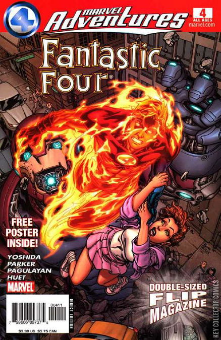 MARVEL ADVENTURES: FANTASTIC FOUR #4 The Fantastic Four don't feel so fantastic when their powers start failing–right when a Sentinel has decided to target them! It's not all bad though; at least Johnny has a cool new girlfriend. Or is all this connected somehow...? MARVEL ADVENTURES: SPIDER-MAN #4 Spider-man and the Human Torch team-up to defeat the combined menace of Street and Goom. This is Street's first appearance. He tries to explain his origin several times but is repeatedly interrupted by Spider-man. Goom is an alien entity from the Negative Zone who talks like he grew up in the 'hood because instead of sending educational programming into the Negative Zone, Johnny turned the reciever to MTV.